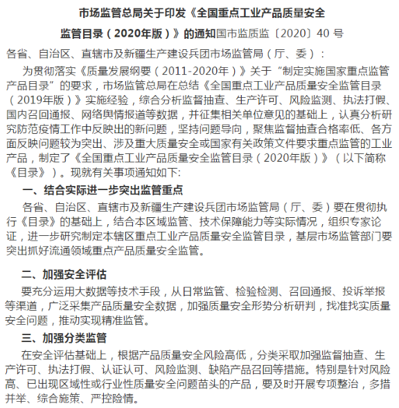 近日,根据市场监管总局印发的《全国重点工业产品质量安全监管目录(2020年版)》通知要求,电动自行车、电动自行车用动力电池、电动自行车充电器等或将成为执法部门的重点监管产品,产品质量不达标,相关产品将会被处以停产、下架、召回等处罚,企业及经销商也将受到处罚。相关内容如下: