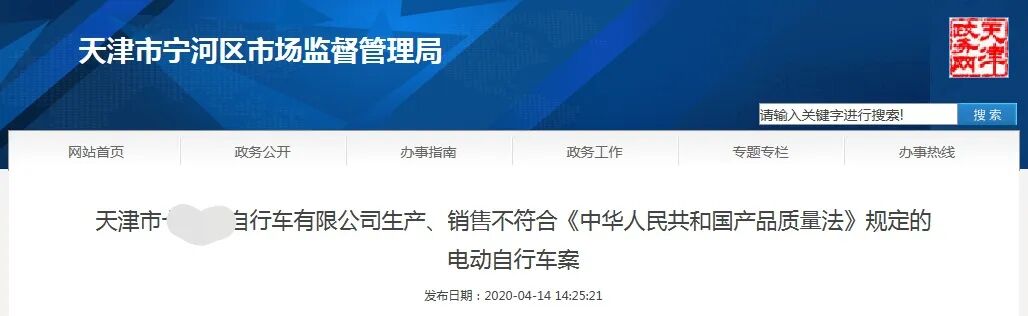 2020年4月14日,天津市宁河区市场监督管理局发布了一份行政处罚书,天津某电动车厂因生产、销售不合格电动自行车,被罚款10400元,没收违法所得116.82元及2辆电动自行车。